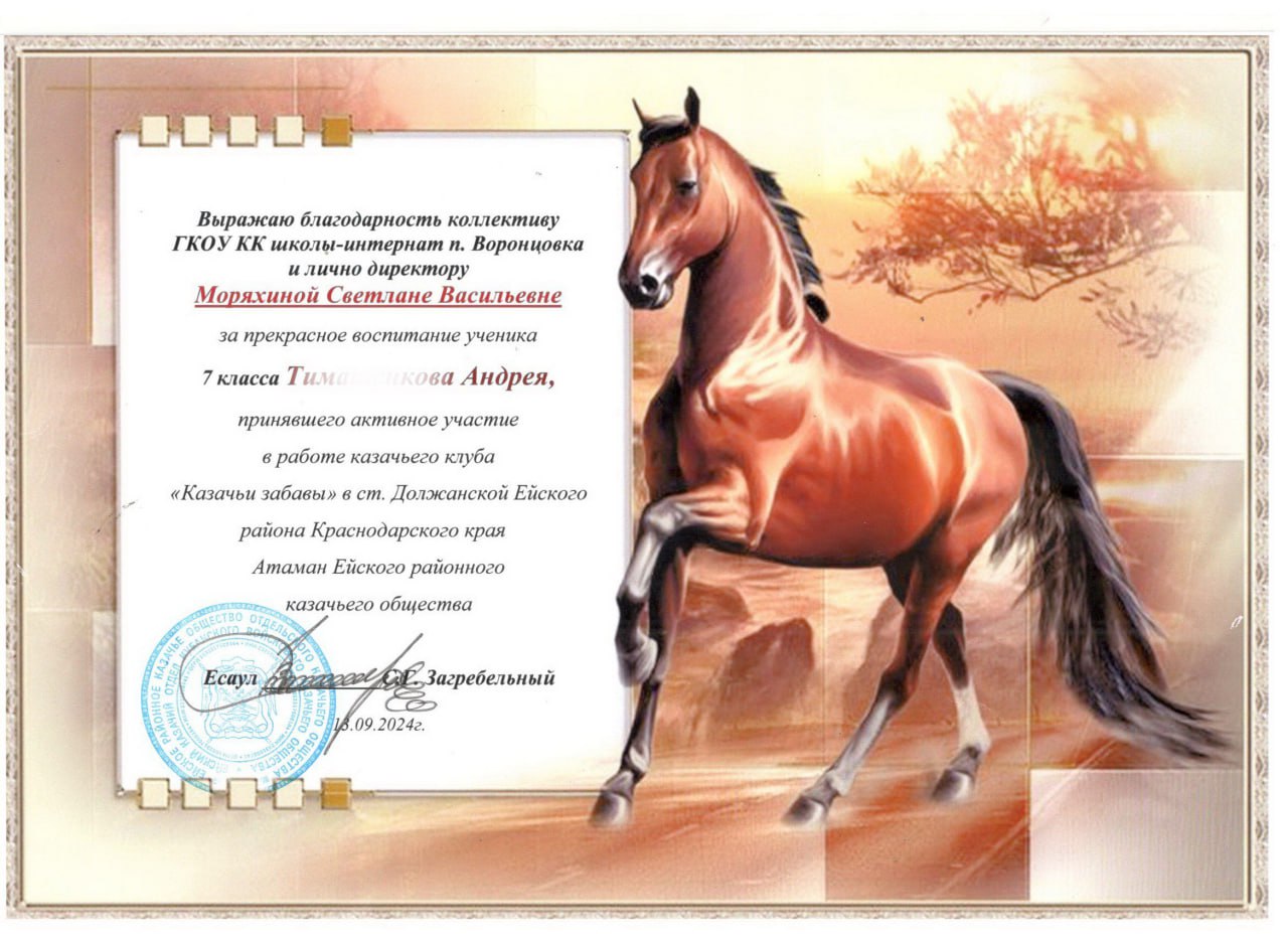 Педагогам всегда очень приятно, когда ученики добиваются успехов в учебе и творчестве. И вдвойне приятно – когда в школу приходят вот такие благодарственные письма, как письмо от атамана Ейского районного казачьего общества. Наш ученик Андрей Т. Давно и успешно занимается в клубе верховой езды «Казачьи забавы». На нашем небольшом видео вы можете посмотреть фрагменты его выступления. Спасибо Андрею за красивое выступление, а педагогам – за воспитание талантливого ученика!