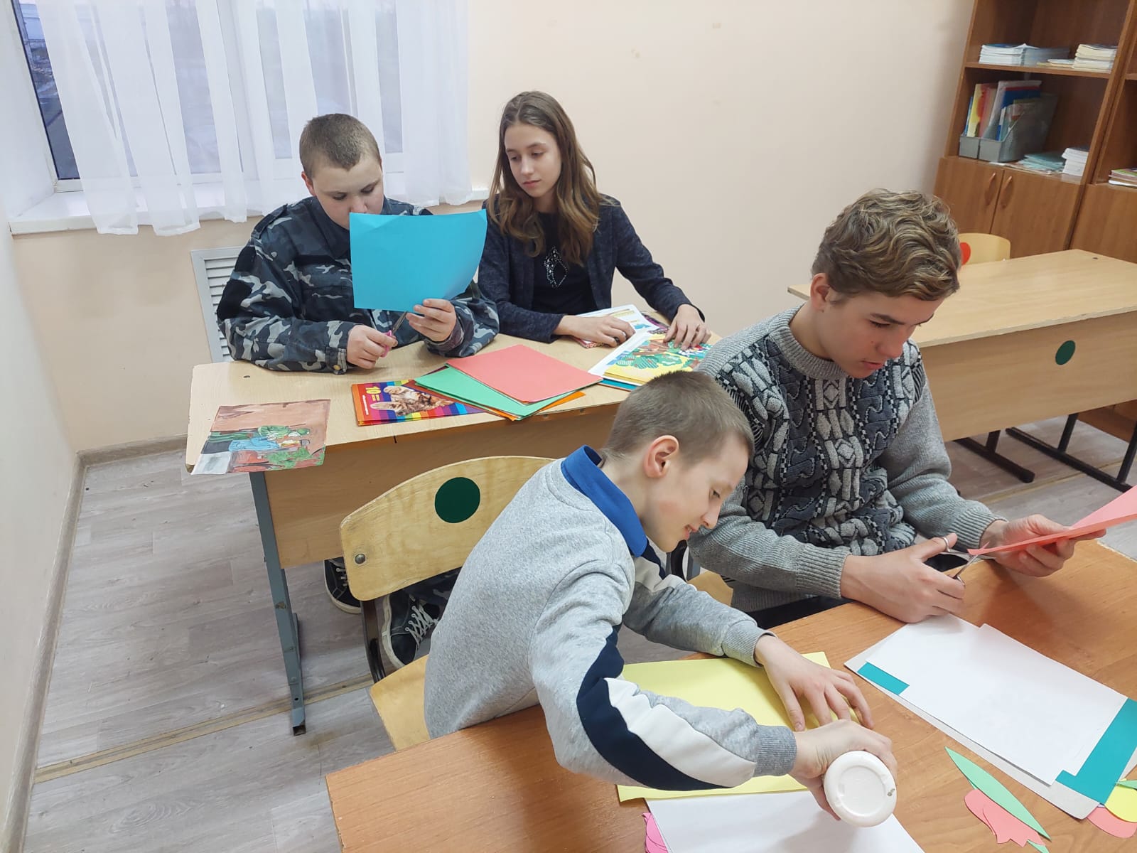 Работа была веселой! Ребята вырезали лепестки, склеивали их и собирали в букеты. Каждый букет получился уникальным и ярким!