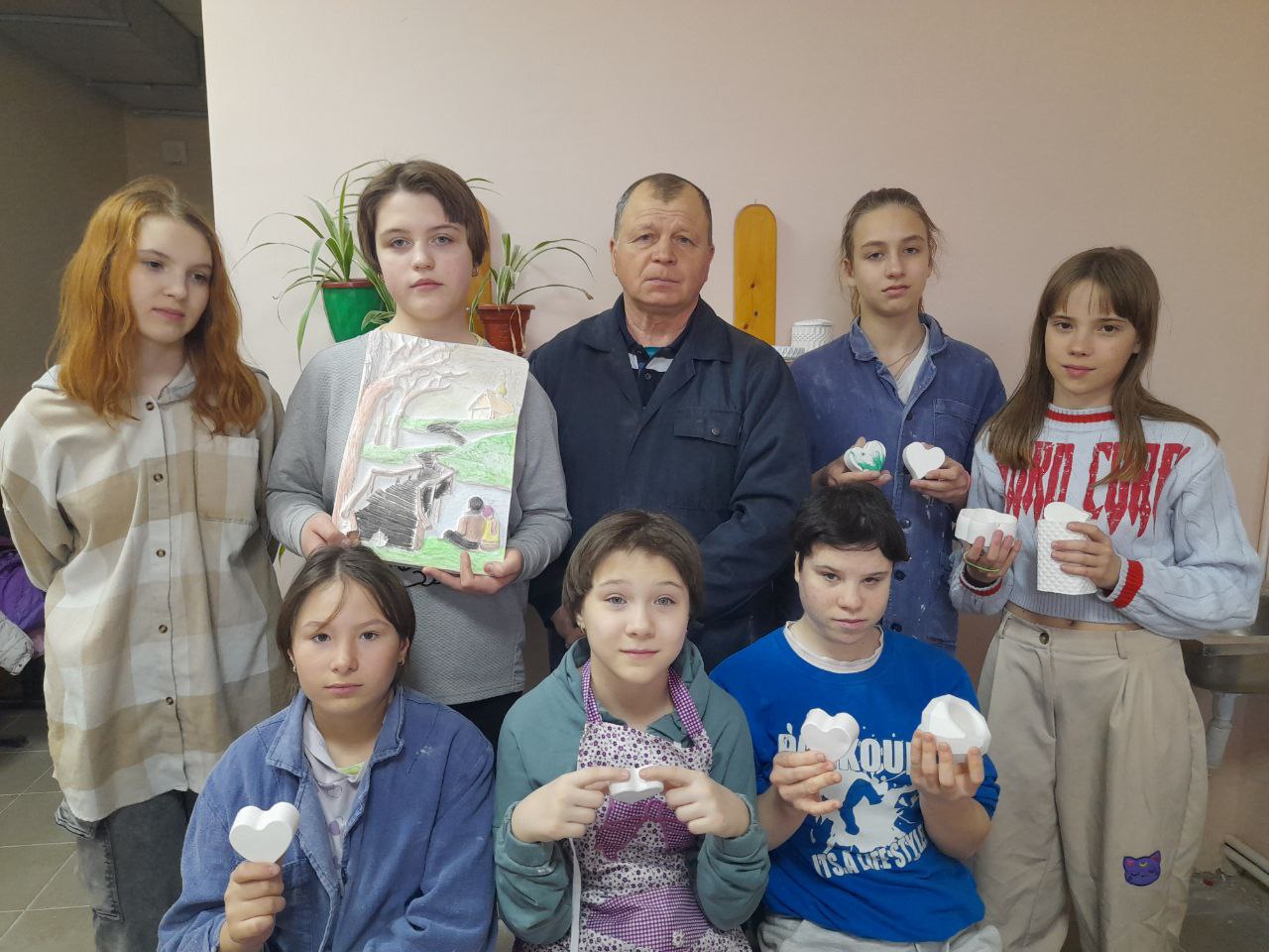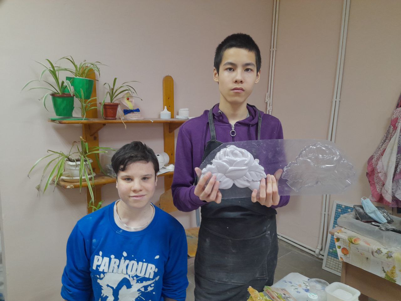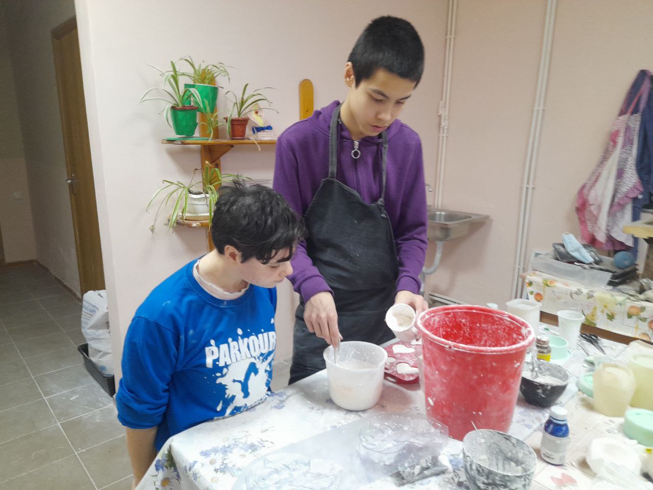 Учащиеся осваивают технику приготовления гипсовой смеси для заливки деталей. Этот процесс увлекательный и требует внимания.